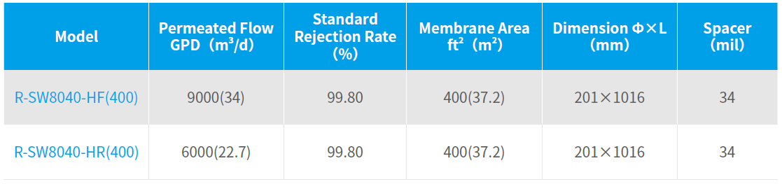 Long service life: Due to unique element structure, post-treatment process as well as 34mil feed spacer, the effective cleaning effect can be reached within a wide range of pH (1~13) and the element becomes more durable;